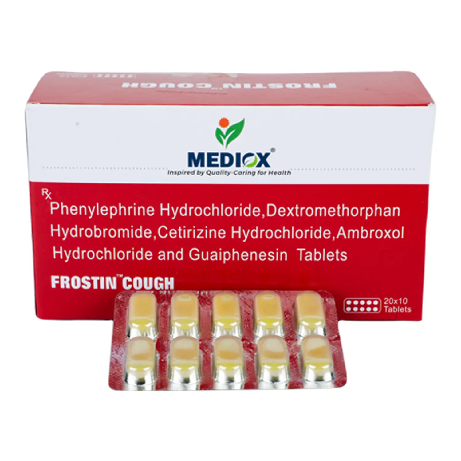 Frostin Cough Tab is a multi-action cough and cold relief formula containing Phenylephrine HCL, Dextromethorphan HCL, Cetirizine HCL, Ambroxol HCL, and Guaiphenesin. It effectively relieves cough, nasal congestion, throat irritation, mucus buildup, and allergy symptoms, providing fast and long-lasting relief.